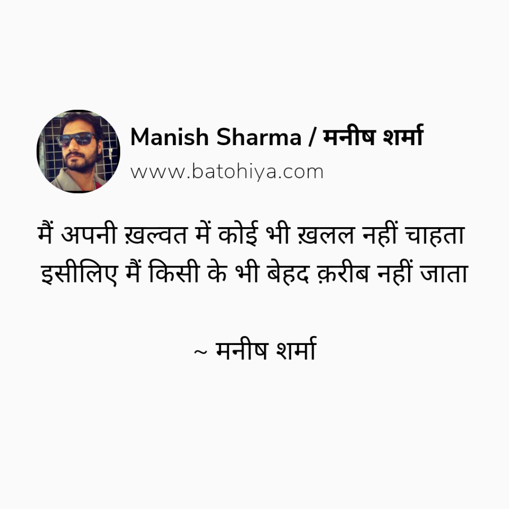 तू तिल तिल क्यूँ मरती है, तू क़तरा क़तरा क्यूँ जलती, पिघलती है हक़ है तेरा, तेरी साँसों पे, तू (स्त्री) इसे मुआशरा के नाम क्यूँ करती है ? ~ मनीष शर्मा