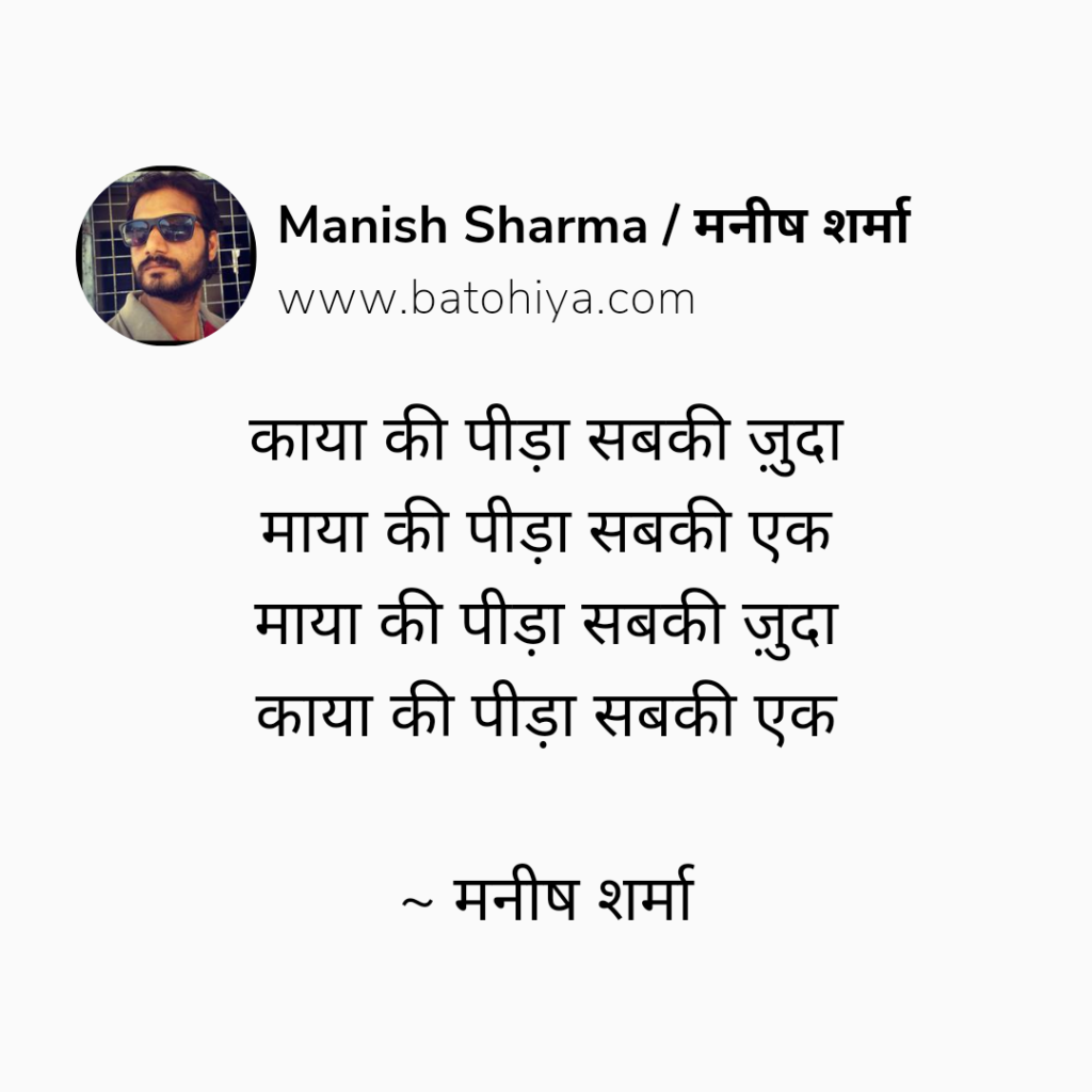 ज़रूरतें जब बेवजह ख़्वाहिशों के लिबास पहन लेती है मुफ़लिसी मुक़द्दर बन इंसान को बे-लिबास कर देती है ~ मनीष शर्मा
